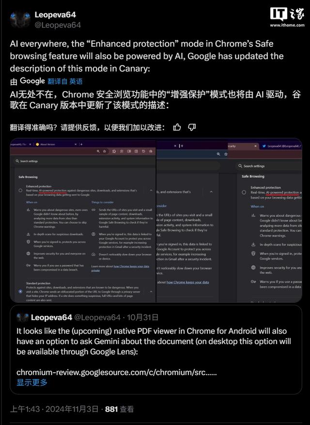 IT之家 11 月 4 日消息,消息源 Leopeva64 于 11 月 3 日在 X 平台发文称,AI 现在已是“无处不在”,Chrome 浏览器安全浏览模式中的“增强保护”将由 AI 驱动,谷歌已…