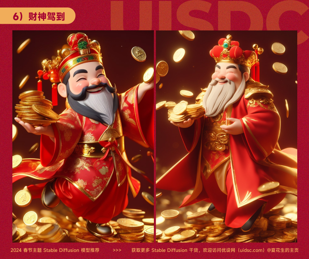 - 正向提示词:God of wealth,full body,lots of gold coins falling,gold coins shining,festive atmosphere,solo,blush,smile,smiling eyes,male focus,wide sleeves,beard,hat,Chinese dress,crown,beard,3D modeling and rendering,high definition,detail enhancement,autolinklora:财神驾到_v1.0:0.8autolink
