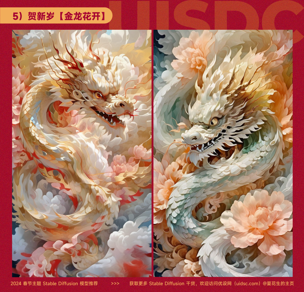 上次推荐了 15 组春节主题的 Midjourney 提示词,不知道大家用起来了没有?今天继续推荐 7 款龙年春节主题的 Stable Diffusion 模型,在 WebUI 或 ComyfyUI 可以用它们免费出图,还可以结合控制插件 ControlNet 让生成的图像更符合设计需求。