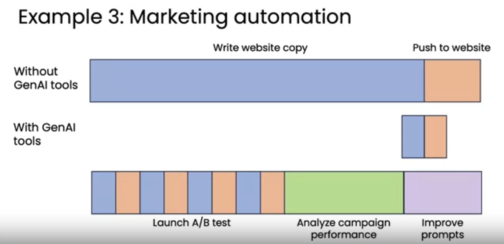 一个市场人员如果没用AI工具,他可能需要2个小时写文案,然后发布,但是如果利用AI工具,他可能需要几十分钟就搞定了,然后快速发布。因为AI为我们提高了效率,那其实从文案的角度,我们可以写多个文案,然后利用A/B测试的方式来看哪些内容更有效,然后再优化prompt就可以了。