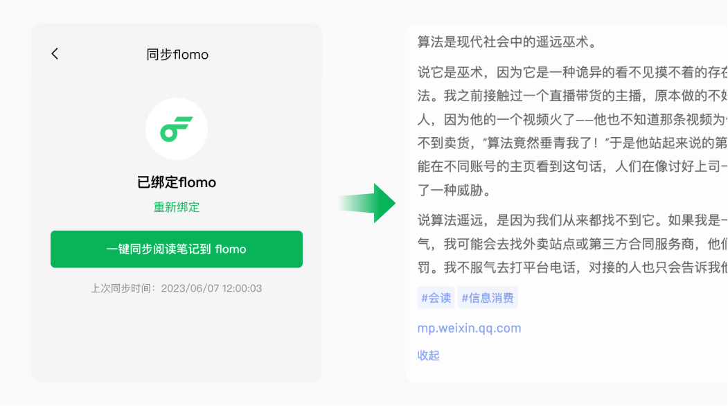 可将上述笔记内容+标签+原文链接,通过API的方式一键同步至你的flomo,让笔记碎片的上下文不再缺失,让个人的知识管理无缝衔接