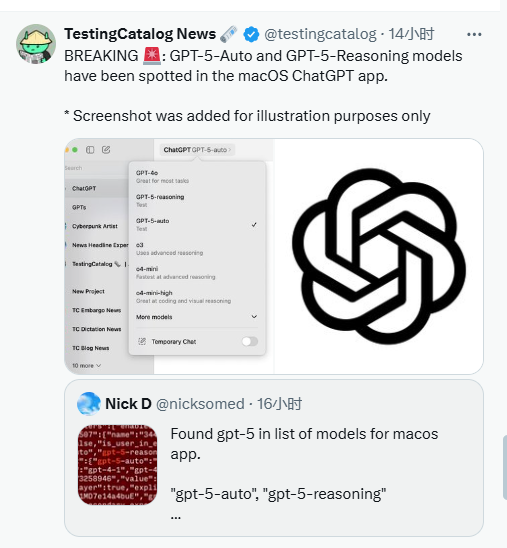 科技社区在 Mac 客户端中发现 OpenAI 可能正在测试的两个新模型 GPT-5-Auto 和 GPT-5-Reasoning,引发了广泛讨论。尽管 OpenAI 尚未正式发布 GPT-5相关信息…