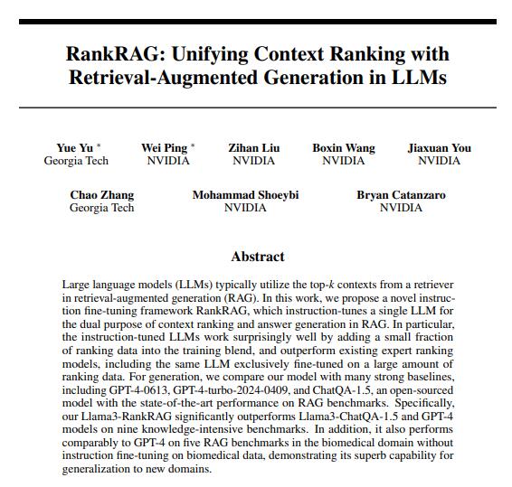 最近,佐治亚理工学院和英伟达的两位华人学者提出了一种名为RankRAG的新型微调框架,这个框架极大简化了原本复杂的RAG流水线,使用微调方法让同一个LLM完成检索、排名和生成任务,结果还实现了性能的大…